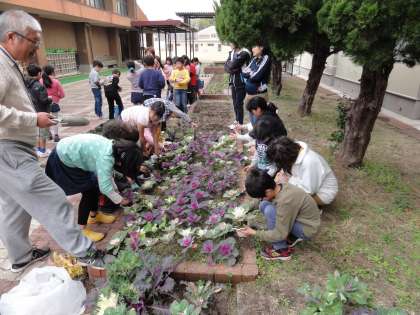 16日(水)の3校時に,住民福祉協議会・学校運営協議会の方にご指導いただいて,種植えをしてから,みんなが育ててきた葉牡丹をいよいよ今日は,植木鉢に寄せ植えです。
