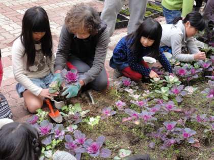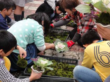 寄せ植えの仕方を説明していただき,花壇に育った葉牡丹からお気に入りを3つ選び,植木鉢に植え替えです。いかに3つをバランスよく植えるか・・・みんな丁寧に植えています。そして,最後に土を盛って,その上に体育館の屋根から取ってこられた苔を貼り付けて寄せ植えの完成!!今日,家に持って帰ってお家の人に見てもらうのをみんな楽しみにしています。