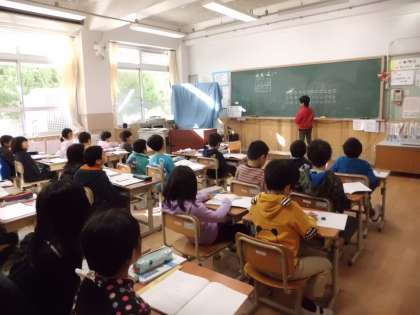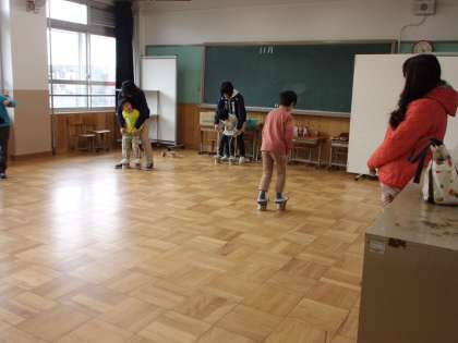 2年生は、かけ算、よつば学級は、竹ぽっくりに乗る練習