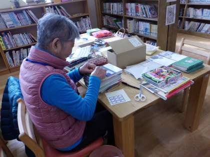 図書整備では、今日は、寄贈図書のラベルを一冊一冊貼ってくださって