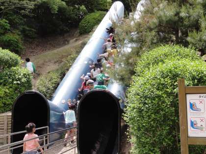 タイムトンネル(滑り台)を何度も滑ったり,水車小屋のある池に足を付けて暑さをしのいでいた子も,いつの間にか服も水浸しではしゃいだりしていました。