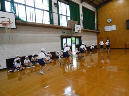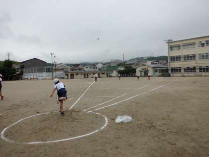 霧雨程度の雨は降っていましたが,何とか運動場でソフトボール投げも実施することができました。体育館では,長座体前屈・反復横跳び・上体起こし・立幅跳びを行いました。