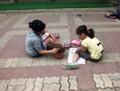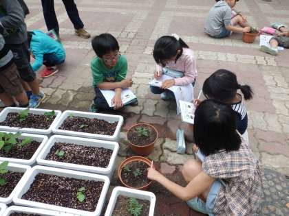 3年生が,理科の時間に植物の観察をしていました。真剣な眼差しで見つめています。