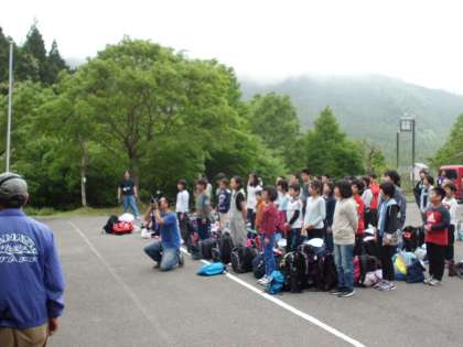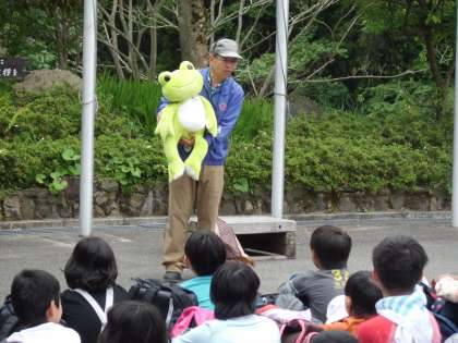 山の家に予定通り到着です。柏野小学校の友達と,バスの中も開所式も一緒にします。これからの活動も楽しみです。入所式では,カエルのハナコロちゃんも山の家の先生と一緒に諸注意など言ってくれました。さあ,これからは,決まりを守ってけがをしないように,協力して楽しく過ごしてくれるでしょう。