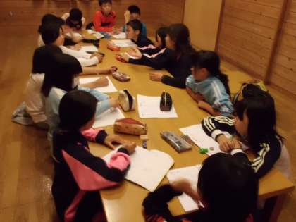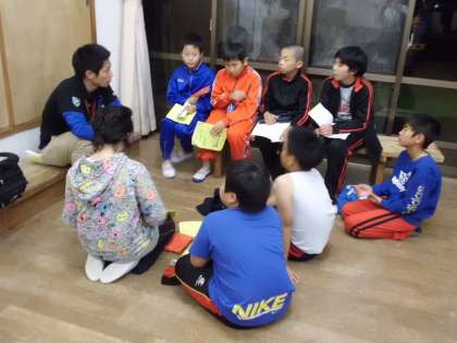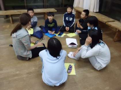 今日1日の振返りのミーティングの時間です。それぞれの係り・活動グループに分かれ今日1日の振返りをしました。反省点も出ましたが,たくさん頑張ったこともありました。明日からも頑張ってくれることでしょう。消灯時間は午後9時30分です。さて,就寝準備をしてすぐに寝られるかな?今日はもうこれでお休みです。