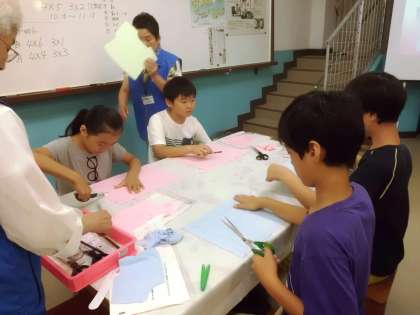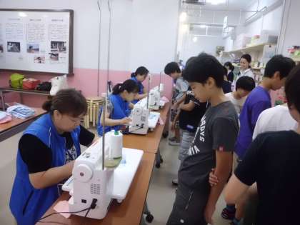 次は,いよいよ制作です。採寸をしたり,型紙で型をとったりと,本格的な作業です。裁断をした後,ミシンがけは,プロの技を見せていただきました。