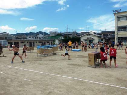 今年は,新たに水風船を使ったゲームも導入されました。水風船を投げ合って,相手陣地の旗を取った方が勝ちです。水風船が当たったら,外に出ます。果敢に飛び出した1年生が,見事に旗をゲットしました。