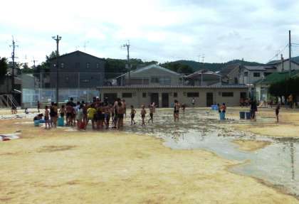 開会式の後は,毎年恒例の水遊び。水鉄砲で水を掛け合って大はしゃぎです。