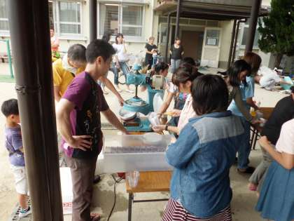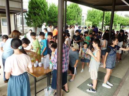 たっぷり遊んだ後は,冷たいかき氷です。初めに支部長さんから,「2〜3杯はいいけど,4杯5杯と食べておなかをこわさないように。」と注意を受けていた子ども達,2〜3杯は食べようと,氷の前に長蛇の列を作っていました。