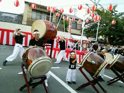 盆踊りの間には,北野天満宮神若会北野天神太鼓会の皆さんによる演奏がありました。小さい子どもからベテランの方まで,息の合った演奏を聞かせてくださいました。