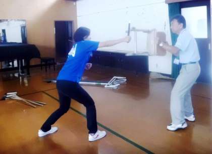 教室に侵入されたらどのように動けばいいのか,警察の方に不審者役になっていただいて実際に動いてみました。また,体育館では,さすまたの使い方を教えていただきました。それ以外に,箒や椅子など身近な物を使って相手の動きを封じる方法も教えていただきました。