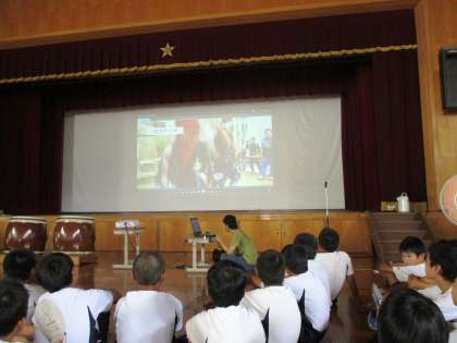 本校では,文化庁の「文化芸術による子供の育成事業」を今年も実施していただけることになりました。本公演は9月26日にあるのですが,5日の3・4時間目に,4〜6年生を対象に,ワークショッフ゜が行われました。