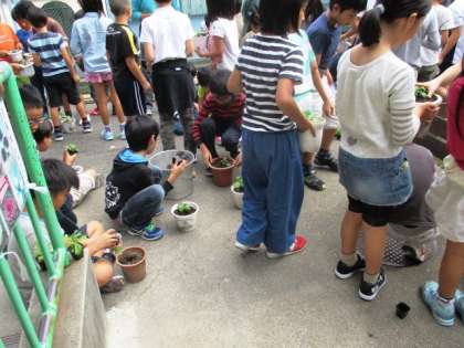 これから,学年ごとに植木鉢に植え替えていきます。今日は,3・4年生が中間休みに植え替えました。明日はよつば学級と1・6年生が植え替え,明後日は2・5年生が植え替えます。