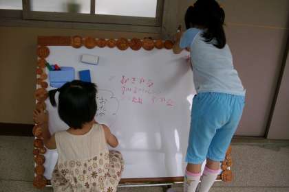 給食室前のホワイトボードには,その日の給食に対する子どもたちの感想がイラストを添えてたくさん書き込まれます。