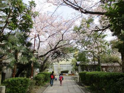 正門を通ると桜が花を咲かせ,きれいなアーチを作っています。学童保育に通う子ども達が,みんなより一足先にくぐって行きました。