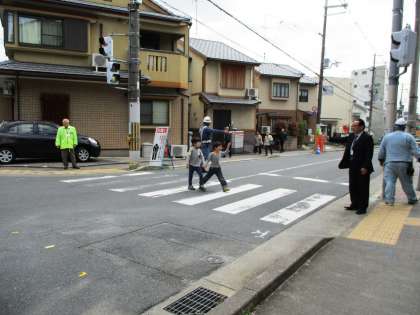 後半は学校の外に出て,実際に横断歩道を渡る練習をしました。七本松通と五辻通の交差点の四つの横断歩道を,自分たちで信号を見て二人ずつ渡りました。信号が青になっても飛び出さず,ちゃんと左右を見て手を挙げて渡れました。