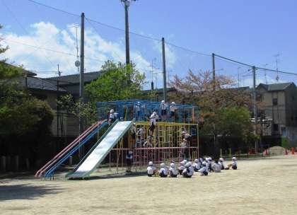 1年生は,総合遊具の最上階まで登れません。だから,滑り台で遊ぶこともできませんでした。2年生になって,体育の時間に先生と一緒に安全な遊び方を勉強してから,休み時間に遊べるようになります。