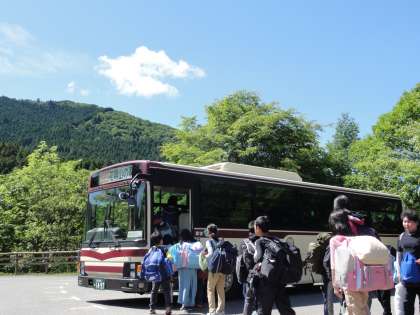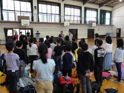 いよいよ山の家ともお別れです。バスに乗り込み出発。学校に到着するとたくさんの保護者の方のお出迎えがありました。体育館での解散式です。4日間の感謝をこめて引率の先生方へのお礼や学生ボランティアの方とのお別れをしました。みんな笑顔でサヨナラをすることができました。保護者の皆様のご準備のおかげで山の家でも無事過ごすことができました。ありがとうございました。帰宅した子どもたちのお話をたくさん聞いてあげてください。