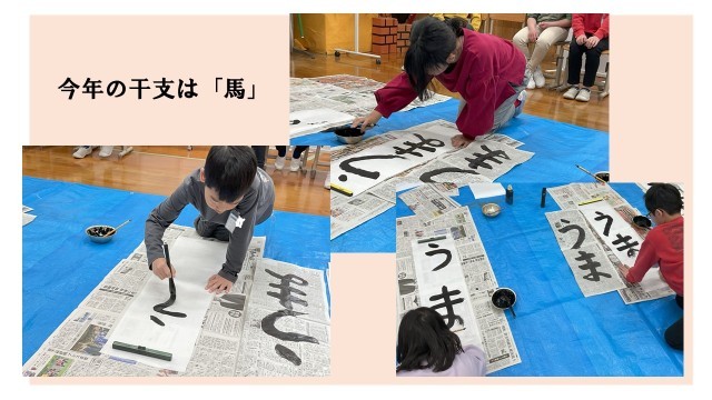 先週の書写の時間に、みんなで今年の干支の「うま」の字を毛筆で書きました。