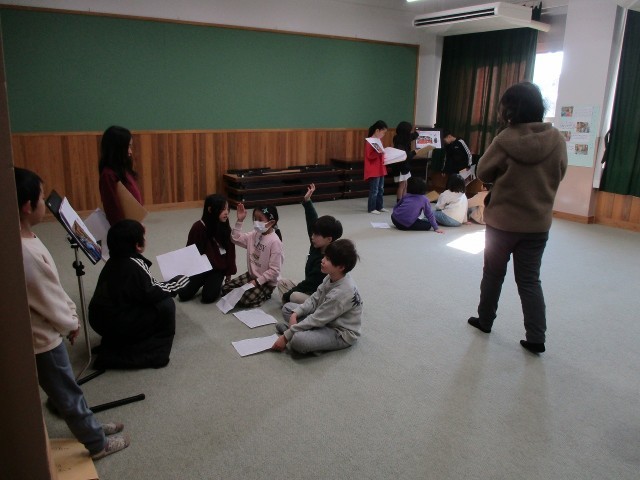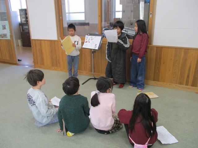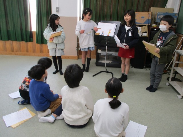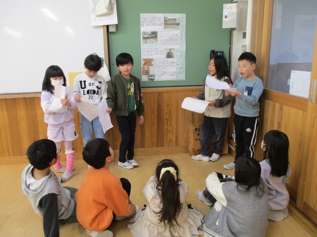 先日の研究授業参観で発表した「まちたんけんのまとめ」を、い組とろ組で発表し合いました。参観の時には少し緊張をしていた子も、今回は大きな声で元気よく発表することができていたのがとても良かったです。また、子ども同士なので意見や質問もたくさん出て、これはこれで保護者の方に見ていただいた時とは違う学びがありました。