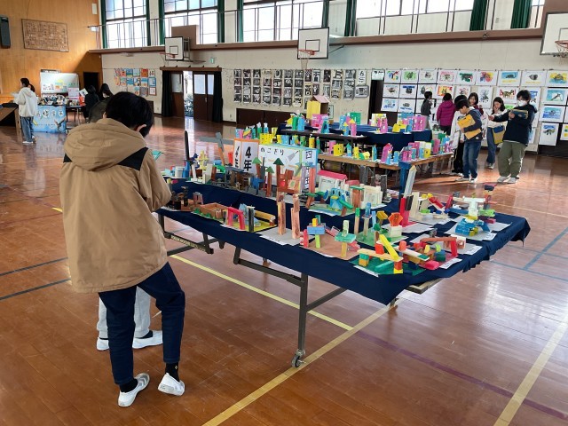 作品展を鑑賞しました。体育館に並んだ多様な作品を見渡しながら、児童は友だちの工夫や表現方法に興味深く目を向けていました。「色の使い方がきれい」「立体の形が面白いね」と感想を伝え合い、互いのよさを見つけながら鑑賞することができました。