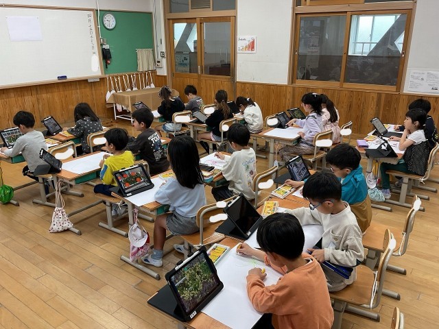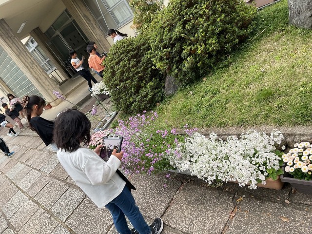 まずはタブレットを持って、校庭に春のお花を探しに行きました。