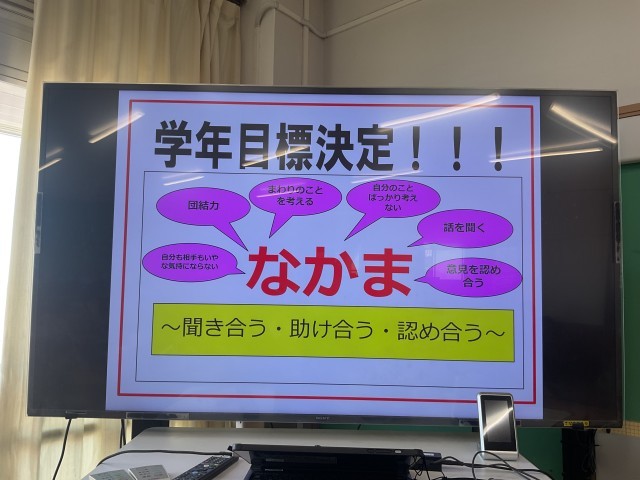 今回の学年集会では、前回に集めた子どもたちの「こんな5年生になりたい」という思いから学年目標を立て、共有しました。
