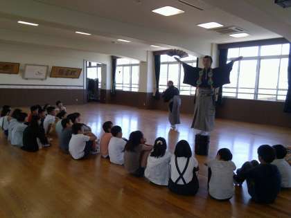5日(月)は「ようこそアーティスト文化芸術とくべつ授業」として,大蔵流狂言師の松本薫先生・鈴木実先生・山下守之先生の3名にお越しいただき,狂言の魅力について教えていただきました。実際に狂言の「柿山伏」を演じていただいたり,所作について教えていただいたりしました。狂言はみんなで笑って楽しめる喜劇です。実際のプロの演技は迫力とユーモアがいっぱいで,子どもたちも興味関心をもって取り組むことができました。子どもたちには今後も様々な芸術や文化に親しんでほしいと思います。