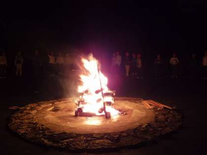 キャンプファイヤーの様子です。「みさきの家に住む火の神様」からいただいた大切な火を囲み,みんなでフォークダンスやゲームを楽しみます。希望の火,友情の火など燃え上がる炎にそれぞれの思いをこめて4年生は今日の一日の活動を終えようとしています。