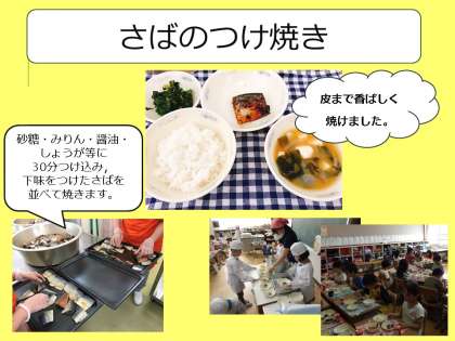 三温糖・みりん・醤油・しょうが等を混ぜ合わせた調味液に30分つけ込み,スチコンで焼き上げます。給食室でも,一切れずつしっかり味がつくように,考えながら調理をしました。焼きあがったさばは,かたちのきれいなまましっかりと焼き色がつき,醤油の香ばしいいい匂いがしました。