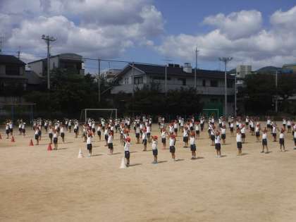 運動会の団体演技で,ダンスに取り組んでいます。2年生のお兄さん・お姉さんと一緒に海賊になりきり,日々練習に励んでいます。今日は,本番で使うバトンを持って踊りました。キラキラ光るバトンを初めて手にして,子どもたちはより一層気合が入ったようです!