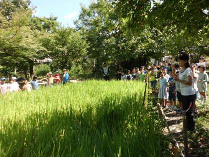 2年生が育てている「お米」の穂が垂れ下がってきています。今日は,スズメをよけるためのテープをはったり,かかしをたてたりしました。これからの成長がたのしみです。