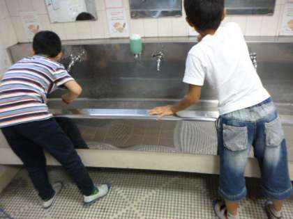 手洗い場のすみずみまでゴシゴシ磨いてきれいになるように