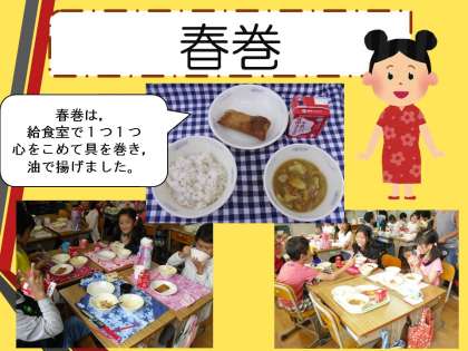 今日の給食は,『春巻』でした。「今日は春巻だ!」「やったあ」と,給食室の前を通る子どもたちは朝からうきうきとした様子でした。