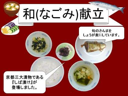 今日は,月に1度和食を推進する『和(なごみ)献立』の日です。『だしのうまみ』,『旬』,『一汁三菜(学校では一汁二菜)』,『伝統食品』,『地産地消』,『新鮮な食品』など,給食の食材を通じて様々なメッセージを届けます。6月〜9月の暑い時期を除き,この日は牛乳がつきません。