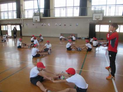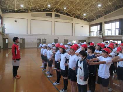 11月10日(金)の3校時では,北野中学校の先生に二回目の出前授業をしていただきました。本日の教科は体育です。名簿順,背の順などに素早く並び替える集団行動や,様々なウォーミングアップを行いました。また,体を動かすだけではなく,中学生になる上での心構えについてもお話していただきました。二回の出前授業を通して中学生になるということに少しずつ実感がわいてきているように思います。残り5か月で,さらに心も体も成長してほしいと思います。