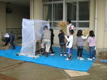 先日、稲刈りをした稲を12日(金)に脱穀しました。お米の先生、石井先生に、足踏み脱穀機の使い方を教えていただきました。初めて見る脱穀機に興味津々。足で踏みながら機械を動かし、稲穂を回しながら、脱穀しました。とっても難しいのですが、みんな楽しみながら脱穀することができました。みんなが育てたお米を食べるのが今から楽しみです。
