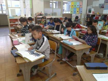 3年生では,国語科「3年とうげ」の学習を進めています。今週から,3年とうげのような民話のお話を,「言動」「人がら」に着目しておもしろかったことを紹介をする学習を進めています。誰一人話さず,集中して読んでいる姿が素晴らしいです。