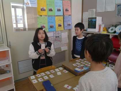 算数科「分数」の学習を進めています。学習の中では,分数カードを使い,分数を大きい順に並べたり,教師側がいった分数のカードをとったりする活動を行い,分数に慣れ親しむことを行っています。分数の説明も上手になってきました。どんどん分数を好きになってほしいです。