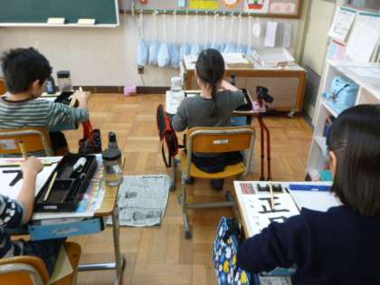 学習したこと「横画」「縦画」「おれ」「はね」「左はらい」を意識して毛筆で「正月」と書きました。正と月のバランスをとることが難しい様子でしたが,何回も練習しているうちにバランスよく書けるようになってきました。集中して取り組んでいました。