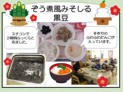 5年生「ぞう煮風みそ汁のさといもと,ふわふわだんごがとてもとろとろでおいしかったです。黒豆は,スチコンで2時間も煮たのですごく甘かったです。」