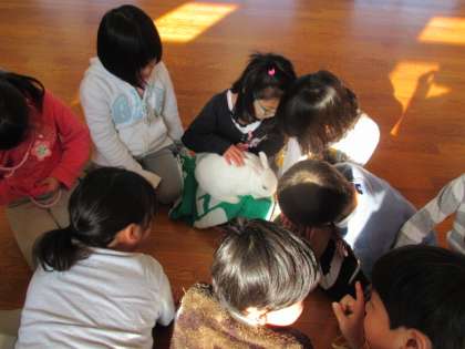 生活科「いきものと なかよし」の学習です。京都市獣医師会のご協力のもと獣医さんにご来校いただき,うさぎのふれあい体験をしました。ひざの上で抱っこをしたり,心臓の音を聞いたりして,今まで以上にうさぎたちが身近に感じられたと思います。子どもたちも,かわいいうさぎの姿に癒されていました。
