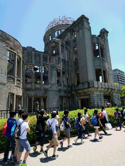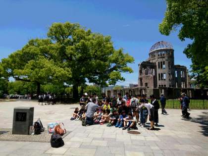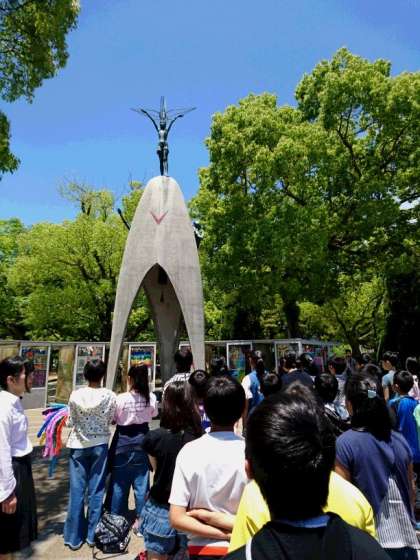 広島平和記念公園で原爆ドームを見学しました。原爆の子の像の前で平和の集いを行いました。全校児童で折った千羽鶴も捧げました。この後は,語り部さんのお話を聞いて資料館を見学します。
