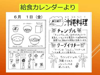 6月1日(金)の給食は,年に一度の沖縄の献立でした。「クーブイリチー」の「クーブ」は,どの食べ物のことでしょう?というクイズをしながら,楽しんで味わうことができました。