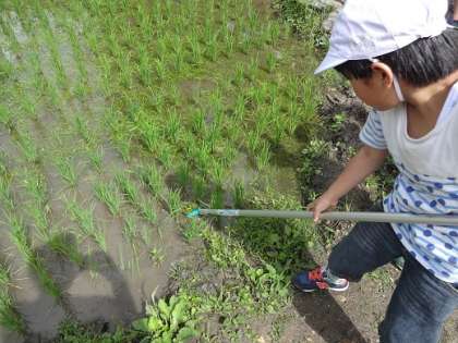 田んぼの苗が順調に育つと同時に,草もたくさん生えてきました。「もし草取りの道具がなかったら,全部手作業なんだなあ。」と,お米作りの大変さを肌で感じながら,たくさん草を取ることができました。