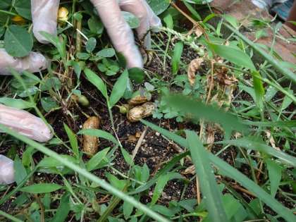 みんなで畑を見に行きました。葉っぱをそっとよけると,土の上にたくさんの落花生ができていました。よく見ると,その中に小さな赤ちゃん落花生が…。「まだ抜きたくない。」「もうちょっと待ってあげよう。」という子どもたちの声から,今日は収穫をやめました。大きくなってほしいですね。