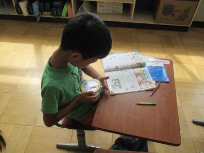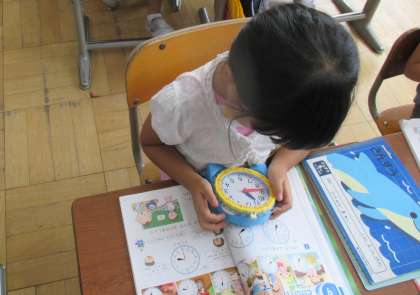 7時に合わせようと,自分の時計をがんばって動かしています。