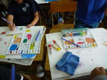絵を見ないで描くので,少し難しかったようで,うーんと考え込んでいる姿が見られました。「わたしが想像したのは暗い部屋です。」「え!明るい部屋を想像したよ」とたくさんの話で盛り上がりました。その話をヒントにみんなで描き進めています。