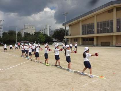 今日は初めて手具を身に付け,「たて!よこ!ななめ!仁和の力!」のダンス・競技の通し練習をしました。子どもたちは手具を付けて嬉しそうでした。今週は,天気も悪そうなので,練習できる時間を大切に自分たちで行動できるようにしてほしいです。