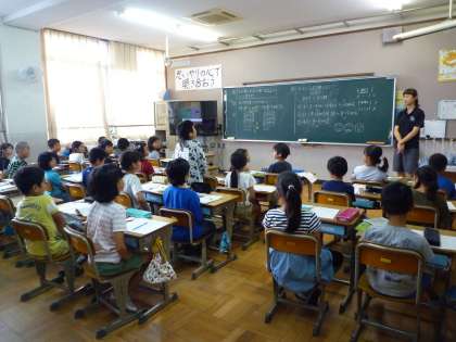それぞれの担任が学年全体を見ていくということで,算数「あまりのあるわり算」では,担任を交代して授業しています。